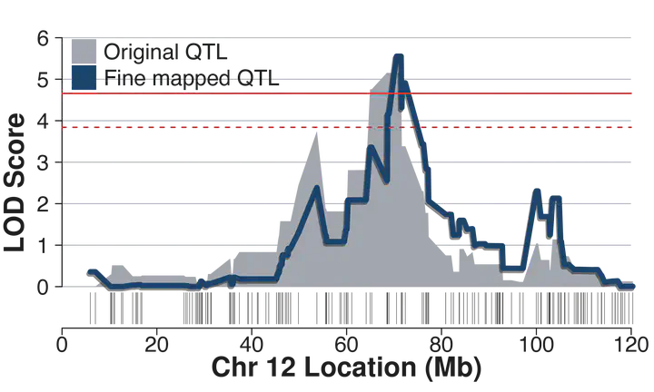 Initial responses to acute ethanol are heritable predictors of an individual’s proclivity for ethanol consumption and long-term risk for alcohol dependence, and provide a convenient model for investigating genetic correlates of susceptibility to alcoholism. Anxiety attenuation is an acute ethanol response of particular importance because anxiolysis is considered a primary motivator for habitual drinkers and substantial comorbidity exists between anxiety disorders and alcohol dependence. Our lab has used the BXD panel of recombinant inbred mice and the light-dark box model of anxiety to dissect genetic variation of the anxiolytic-like response to acute ethanol. All strains received IP injections of ethanol (1.8g/kg) or saline 10 minutes prior to entering the light-dark box. Global gene expression levels in prefrontal cortex and nucleus accumbens were concurrently measured across BXD lines from both treatment groups using Affymetrix microarrays. We have recently identified a quantitative trait locus (QTL) significantly associated (LOD 4.7) with acute ethanol-induced anxiolysis (Etanq1) on chromosome 12. The initial support interval for Etanq1 covered 26.2 megabases (Mb), including 137 known or predicted genes. Here, we present results of our initial effort to fine-map Etanq1 by studying novel BXD lines from an advanced intercross that carry informative recombinations within the Etanq1 support interval. The additional strains increased the LOD score of Etanq1 to 5.68 and reduced the support interval to approximately 10 Mb. The updated interval now spans 65.9-74.9 Mb on Chr12 and contains 80 genes. We used the BXD microarray data to facilitate the process of screening for candidate genes by conducting expression QTL (eQTL) analysis. Genes showing cis eQTLs within the Etanq1 region are considered strong candidates, since the local sequence polymorphisms driving the allele-specific differences in expression may be modulating the degree of anxiolysis induced by acute ethanol. We have identified 14 cis eQTLs with LOD scores ≥ 3 in the support interval, representing 7 unique genes. Bioinformatic analysis suggests these cis eQTLs are not due to polymorphisms affecting microarray performance and show that several genes have strong correlations with our behavioral phenotype. These results may identify novel mechanisms underlying ethanol anxiolysis and provide new candidates for future interventions in alcoholism. Supported by NIAAA INIA grants AA016667 and AA016662.